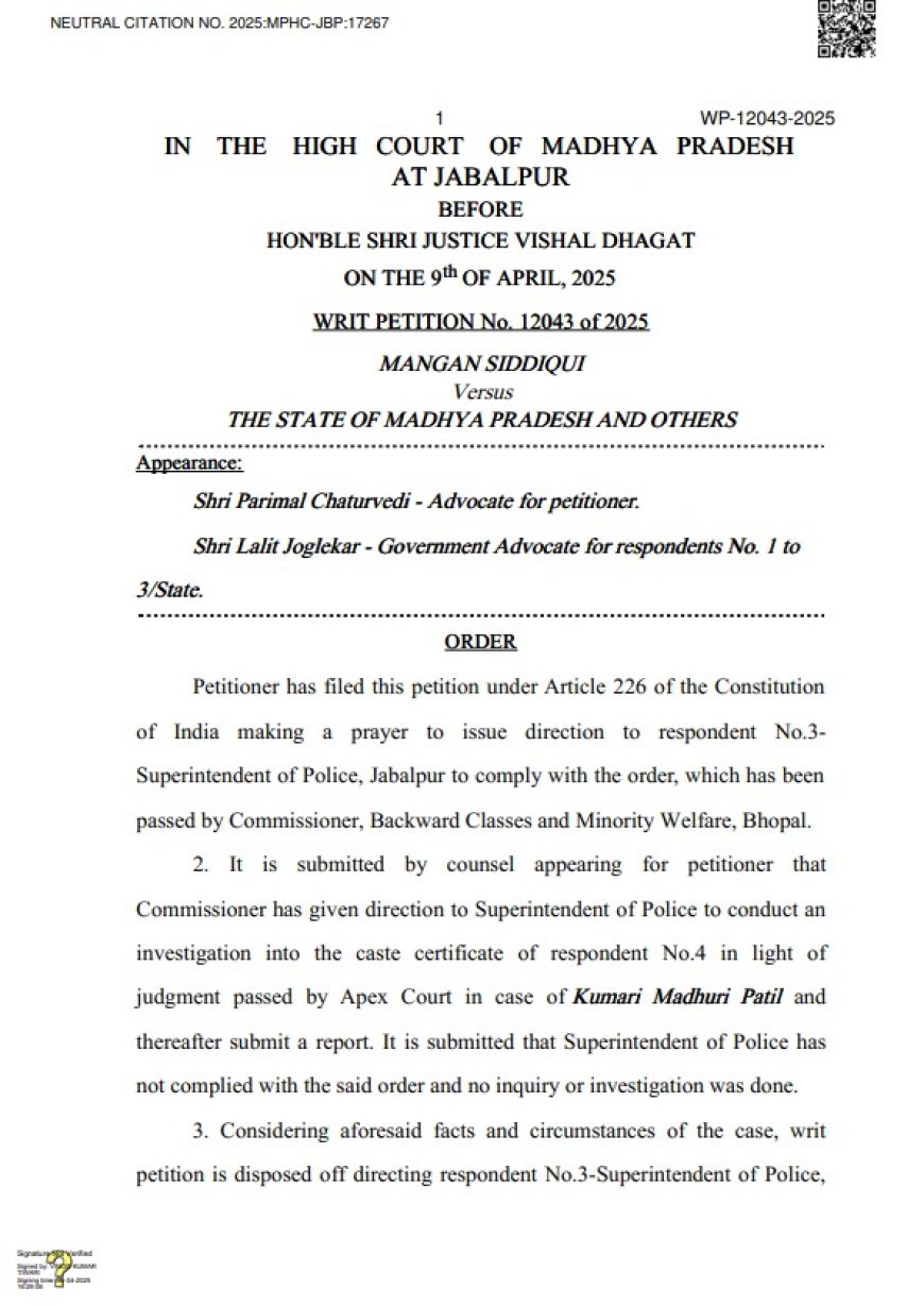 याचिकाकर्ता जबलपुर निवासी मंगन सिद्दीकी की ओर से अधिवक्ता परिमल चतुर्वेदी, सुयश श्रीवास्तव, विशेष पाण्डेय व शारिक ने पक्ष रखा। उन्होंने दलील दी कि जबलपुर एसपी को आयुक्त, पिछड़ा वर्ग एवं अल्पसंख्यक कल्याण, भोपाल द्वारा पारित आदेश का अनुपालन करने का निर्देश दिया जाए। ऐसा इसलिए क्योंकि आयुक्त ने एसपी को कुमारी माधुरी पाटिल के मामले में सर्वोच्च न्यायालय द्वारा पारित निर्णय के आलोक में पार्षद मोहम्मद कलीम के जाति प्रमाण पत्र की जांच करने तथा उसके पश्चात रिपोर्ट प्रस्तुत करने का निर्देश दिया है। एसपी ने उक्त आदेश का अनुपालन नहीं किया है तथा कोई जांच या अन्वेषण नहीं किया गया है। हाई कोर्ट ने मामले के उपरोक्त तथ्यों व परिस्थितियों पर विचार करते हुए एसपी को निर्देश देते हुए याचिका का इस निर्देश के साथ पटाक्षेप कर दिया कि हाई कोर्ट के आदेश की प्रमाणित प्रति प्राप्त होने से 60 दिनों की अवधि के भीतर एसपी अपनी जांच रिपोर्ट आयुक्त के समक्ष प्रस्तुत करें।