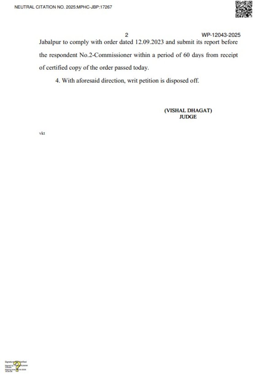 हाईकोर्ट के न्यायमूर्ति विशाल धगट की एकलपीठ ने एक याचिका का इस निर्देश के साथ निराकरण कर दिया कि जबलपुर एसपी जाति प्रमाण पत्र की जांच कर रिपोर्ट आयुक्त, पिछड़ा वर्ग एवं अल्पसंख्यक कल्याण, भोपाल के समक्ष प्रस्तुत करें।