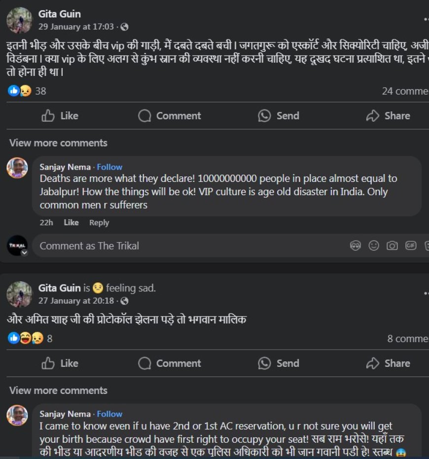 नेताजी सुभाषचंद्र बोस मेडिकल कॉलेज की गायनिक डिपार्टमेंट की प्रोफेसर डॉ.गीता गुइन हाल ही में प्रयागराज से कुंभ स्नान कर लौटी हैं। वहां से आने बाद का वहां की व्यवस्थाओं को लेकर असंतोष जाहिर किया है। उन्होंने अपने सोशल मीडिया अकाउंट पर पोस्ट कर देश के गृह मंत्री अमित शाह को मिले वीआईपी ट्रीटमेंट पर भी सवाल खड़े किए हैं। इनके साथ ही हिंदू धर्माचार्य जगतगुरु शंकराचार्य को मिल रही सरकारी सुविधाओं को लेकर भी तिप्पणी की है। उनके इस पोस्ट के बाद प्रदेश के कई लोग अपनी प्रतिक्रियाएं दे रहे हैं।